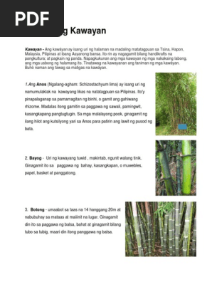 Kawayan ay isa sa mga pinakakilalang uri ng halaman dahil sa taglay nitong tatag. Ang pitong iba pa ay. Bayog ito ay isang uri ng kawayan na pinakamakunat tuwid makintab at walang tinik kung.