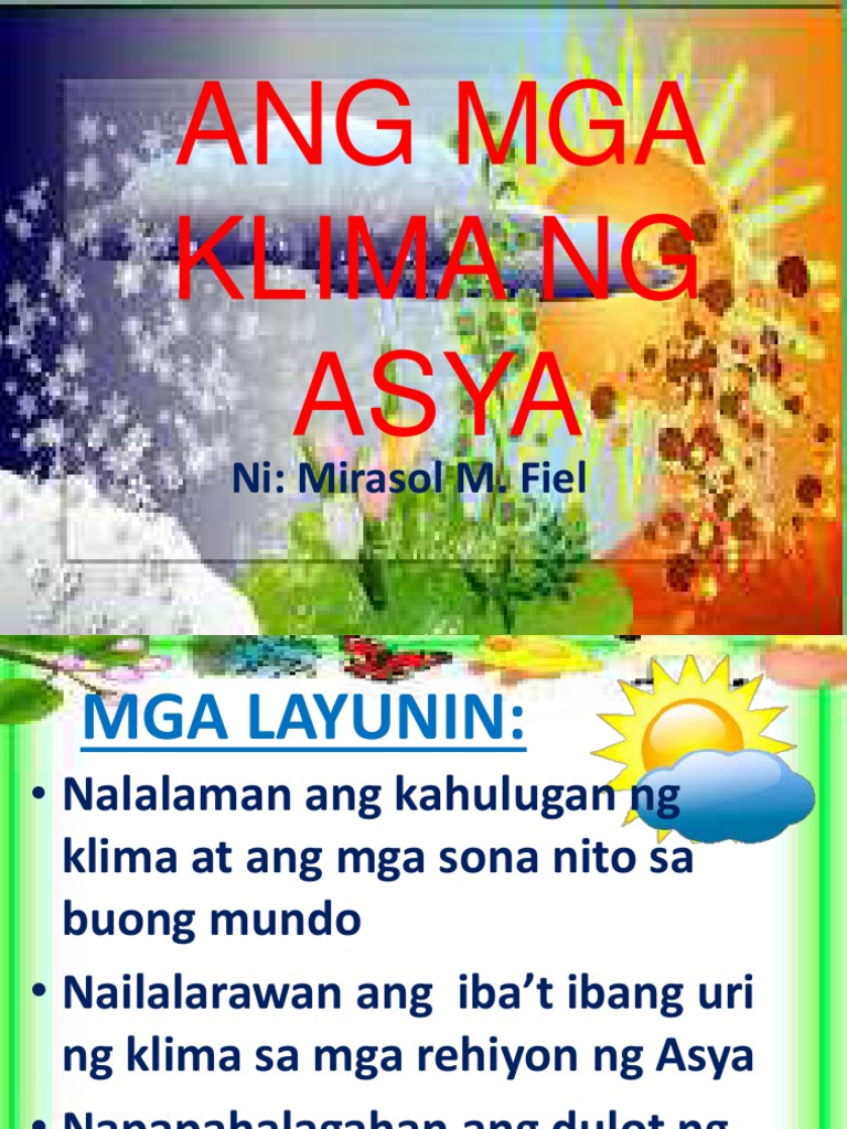 ALAMIN MO GRADE IV BAKIT IBA-IBA ANG KLIMA AT PANAHON NG MUNDO. Iiba-iba ng klima ng isang lugar. Ang ilang mga klima ay may ibat ibang mga panahon at maaaring may kaunti o maraming pagkakaiba-iba sa ulan at temperatura.